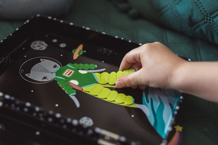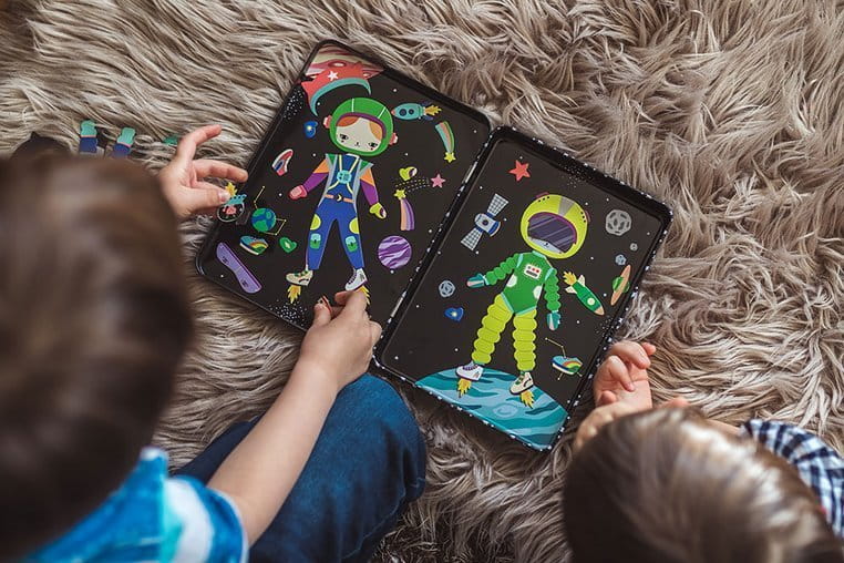 Zestaw magnesów do tworzenia postaci Kosmiczny kot amerykańskiej marki MUDPUPPY to wyjątkowo kreatywna zabawka dla dzieci od 4 roku życia. Na 2 tłach na wewnętrznych stronach metalowego pudełka przedstawiona jest przestrzeń kosmiczna i dwie oryginalne postacie kotów - astronautów. Można na nich umieszczać wybrane magnesy - stroje, tj. kaski, kombinezony, buty z napędem rakietowym oraz inne dodatki, np. satelity czy ciała niebieskie (ponad 50 elementów), tworząc przy tym wiele ciekawych opowieści. Zabawka ma poręczny format, sprawdza się w domu i w podróży.