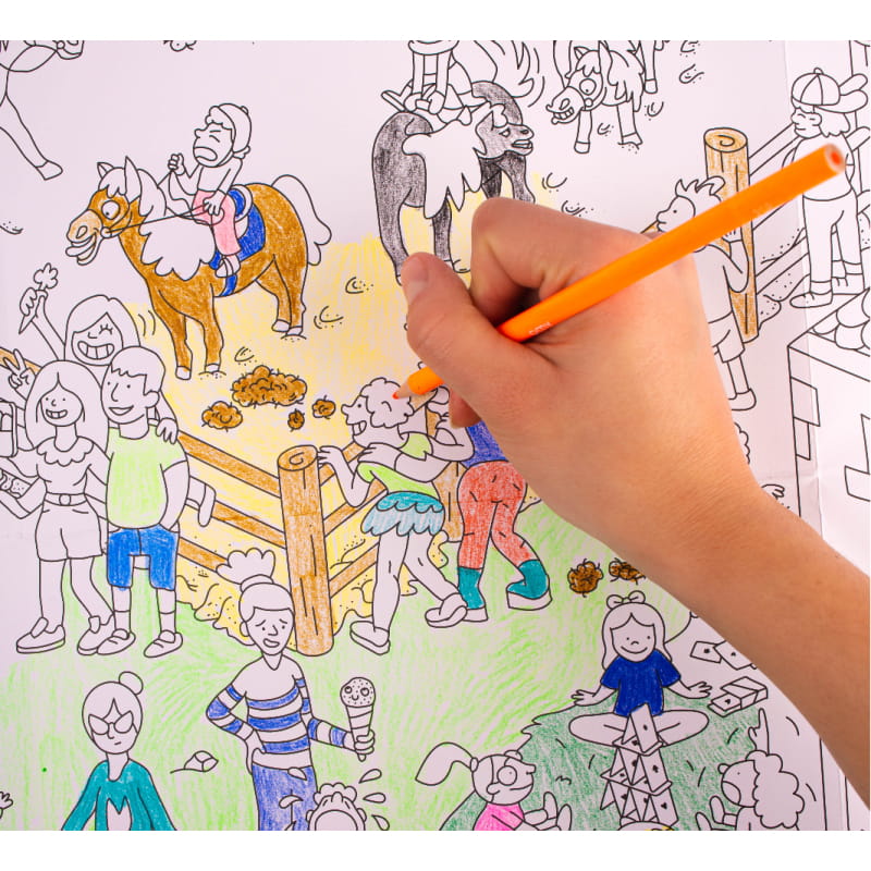 Ten gigantyczny plakat został stworzony wszystkich miłośników koni i małych pasjonatów jeździectwa: odwiedź klub jeździecki, sprawdź jak opiekować się zwierzętami, a na końcu odwiedź sportowe wyczyny na wielkiej arenie. Mnóstwo szczegółów do pokolorowania z niepowtarzalnym humorem Omy'ego!