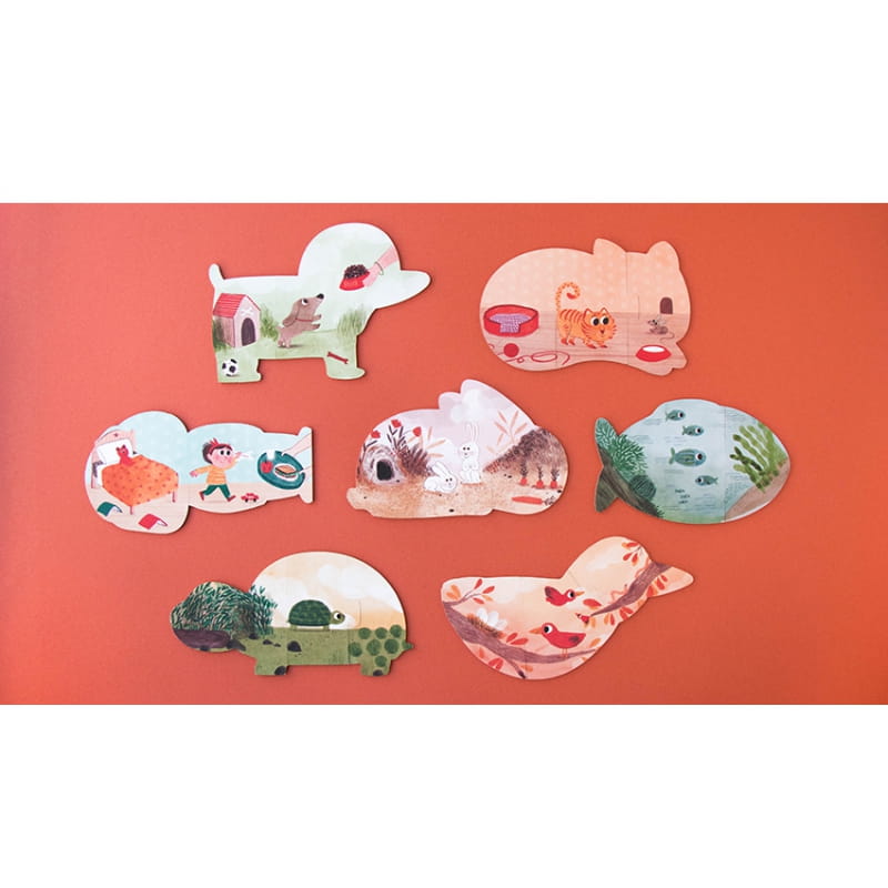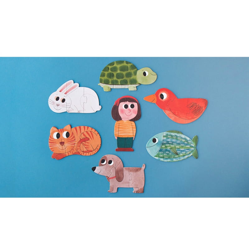 Maluch ma za zadanie ułożenie postaci sześciu zwierzaczków oraz dziewczynki. Każda z sekcji składa się z trzech elementów puzzli. Po odwróceniu obrazka można zobaczyć scenkę związaną ze zwierzątkiem.