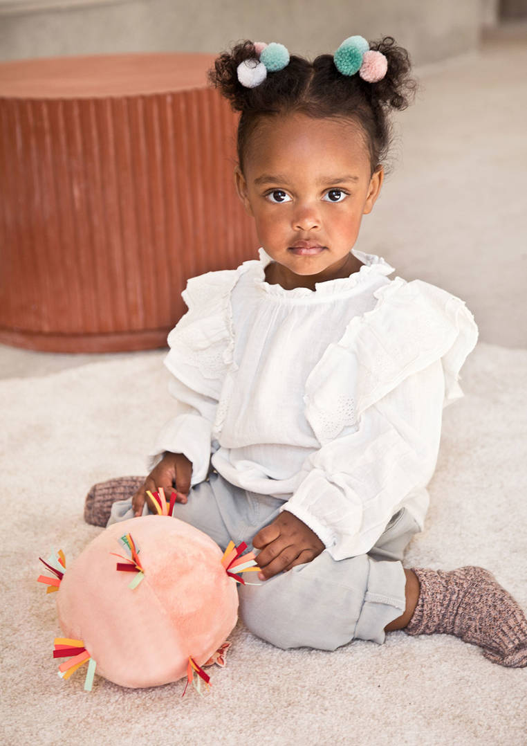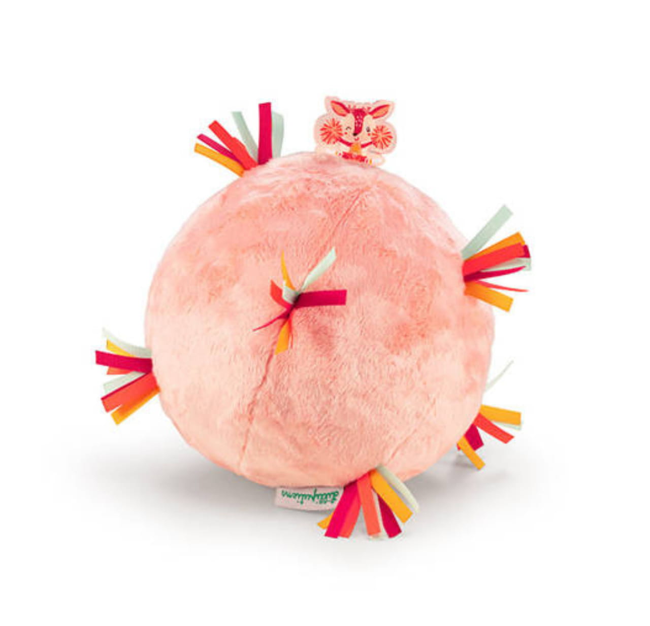 Piłeczka dźwiękowa z kolekcji Sarenka Stella belgijskiej marki Lilliputiens to miękka aktywizująca zabawka dla niemowląt. Piłka jest wykonana z jasnoróżowego futerka, ma wiele stymulujących sensorycznie wypustek z kolorowych wstążeczek i metkę z Sarenką Stellą, a także ukrytą wewnątrz pozytywkę (uruchamianą przyciskiem) z 7 różnymi dźwiękami, m.in. trąbki czy marakasów. Jest poręczna i całkowicie bezpieczna. Odpowiada na potrzebę turlania i rzucania przedmiotów, co jest naturalnym etapem rozwoju maluszka, a przy okazji rozwija małą motorykę (chwyt, potrząsanie), aktywizuje zmysł dotyku i słuchu (gra).