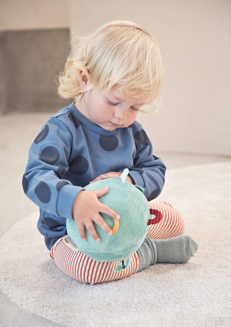 Piłeczka dźwiękowa z kolekcji Smok Joe belgijskiej marki Lilliputiens to miękka aktywizująca zabawka dla niemowląt. Piłka jest wykonana z pastelowo-zielonej strukturalnej tkaniny, ma wiele stymulujących sensorycznie kolorowych mini-uchwytów i metkę ze Smokiem Joe, a także ukrytą wewnątrz pozytywkę (uruchamianą przyciskiem) z 7 różnymi dźwiękami, m.in. trąbki czy marakasów. Jest poręczna i całkowicie bezpieczna. Odpowiada na potrzebę turlania i rzucania przedmiotów, co jest naturalnym etapem rozwoju maluszka, a przy okazji rozwija małą motorykę (chwyt, potrząsanie), aktywizuje zmysł dotyku i słuchu (gra).