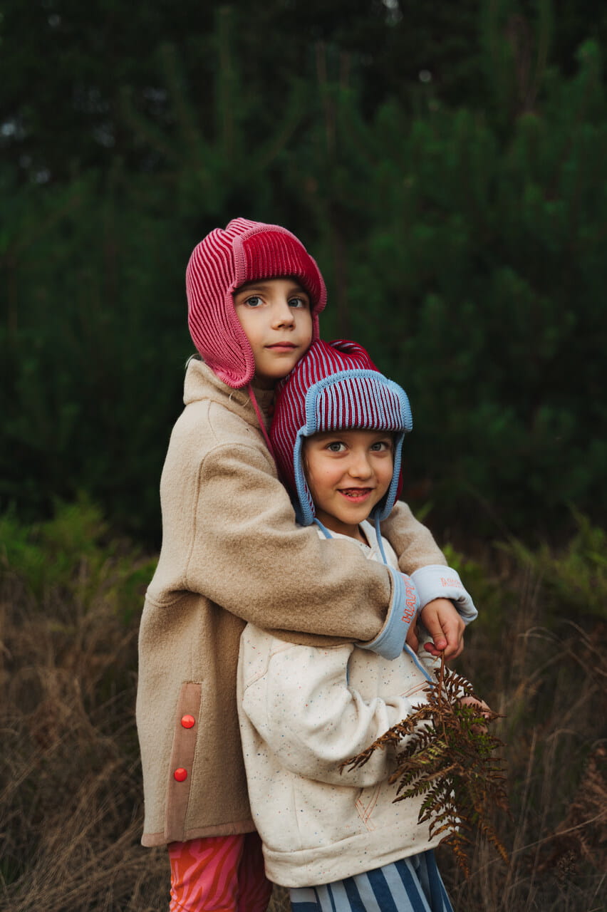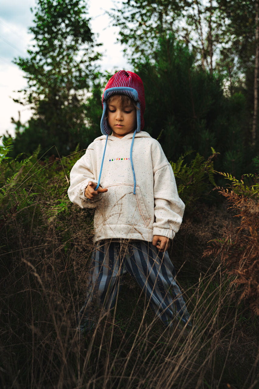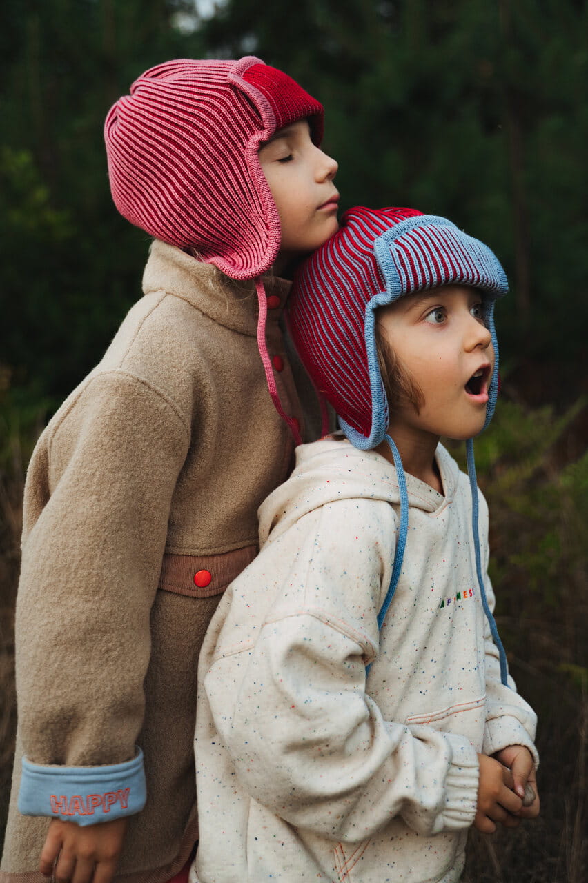Prążkowana czapka o kroju pilotki wykonana z najlepszej jakości wełny merino. Zakrywa uszy, zapewniając dziecku ciepło i komfort w chłodne dni. Można związać ją pod brodą za pomocą sznurków.