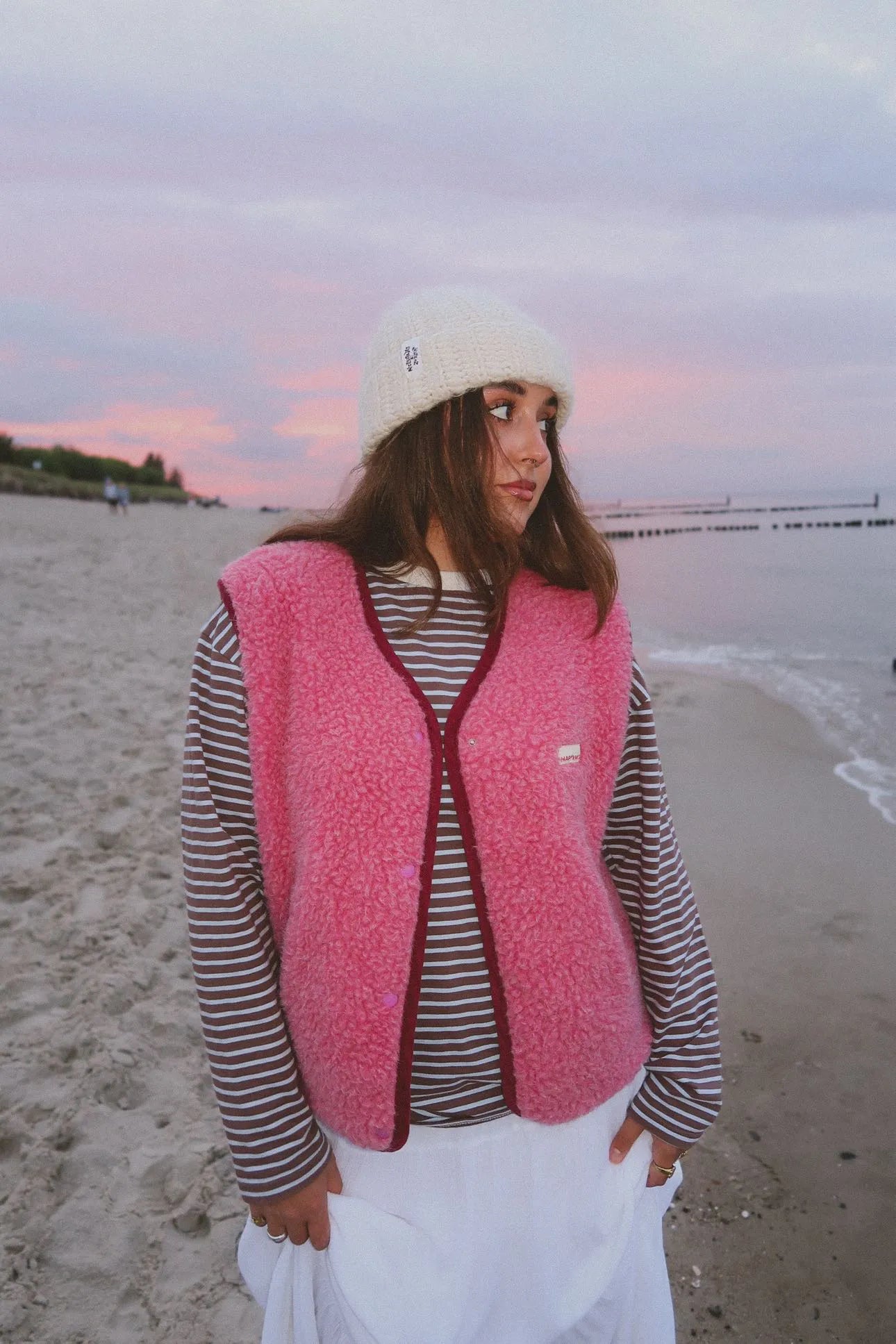 Kamizelka zapewnia wygodę i swobodę ruchów dzięki oversize'owemu krojowi. Wełna merino dostosowuje się do temperatury, co sprawia, że jest idealna jako dodatkowe źródło ciepła. Z przodu ma dwie wewnętrzne kieszenie, zapinana na napy. Na piersi znajduje się naszywka z autorskim motywem pieska, która nadaje jej wyjątkowego charakteru najnowszej kolekcji Happymess Winter Club. Uszyta w Polsce.