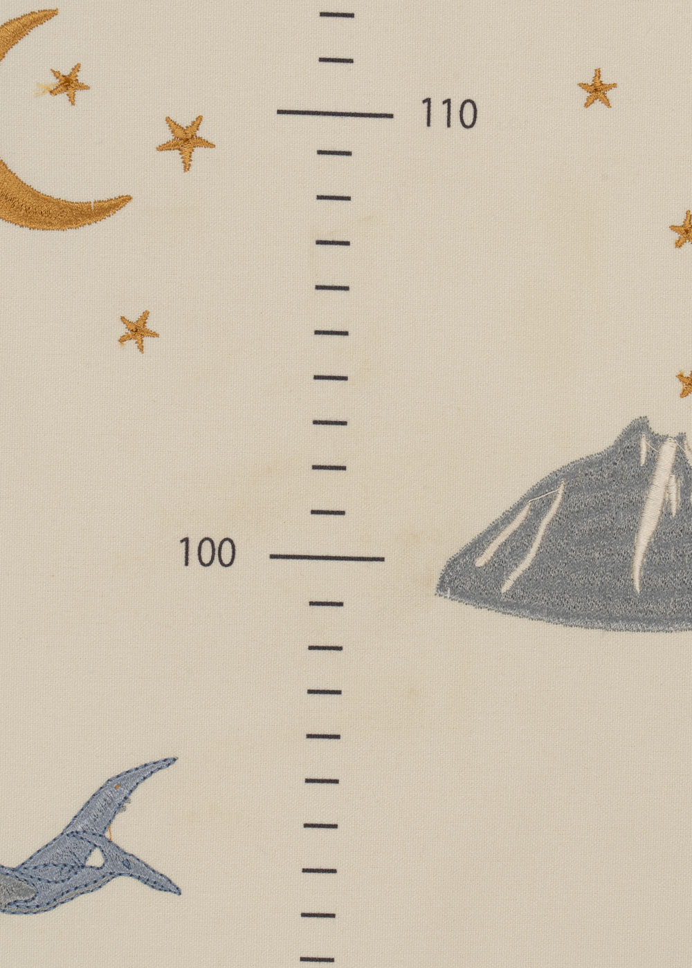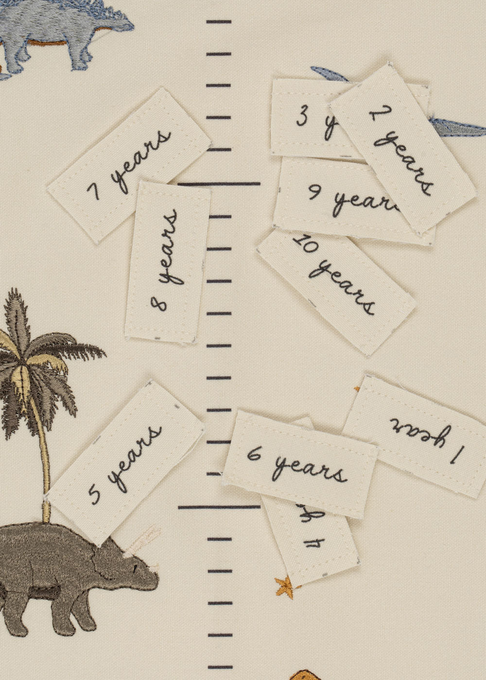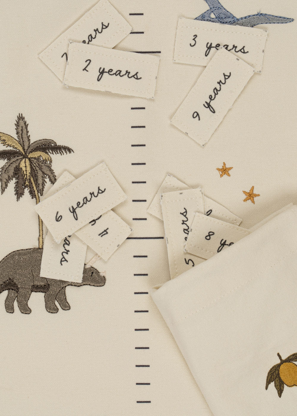 Miarka do mierzenia wzrostu u dzieci wykonana jest w 100% z bawełny organicznej. Zaprojektowana z haftem i praktycznym sznurkiem na górze miarki. Do każdej planszy dołączony jest zestaw etykiet do naprasowania na planszę, pokazujących wzrost dziecka w różnym wieku (1 - 10 lat - max 160 cm).