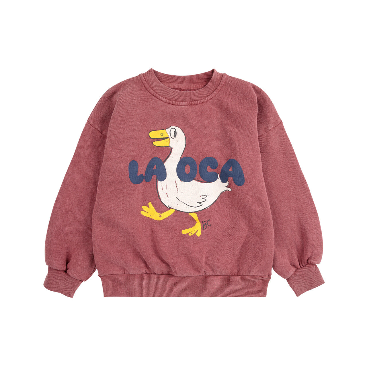 Przytulna bluza w kolorze brązowym z motywem kaczki. Wykonana z bawełny organicznej. Posiada długie rękawy, prążkowane mankiety, luźny krój, prążkowany dół, okrągły dekolt i wewnętrzny szczotkowany polar. Odpowiedzialna produkcja w Hiszpanii.