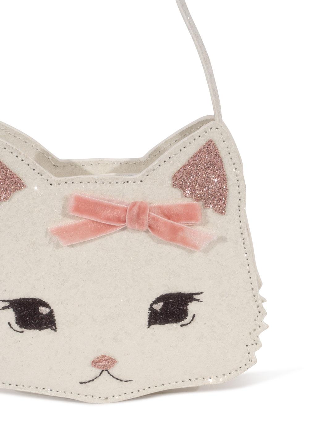 Brokatowa torebka na ramię w kształcie kotka. Zaprojektowana z brokatem i wąskim paskiem na ramię. Posiada jedną komorę i zapięcie na suwak.