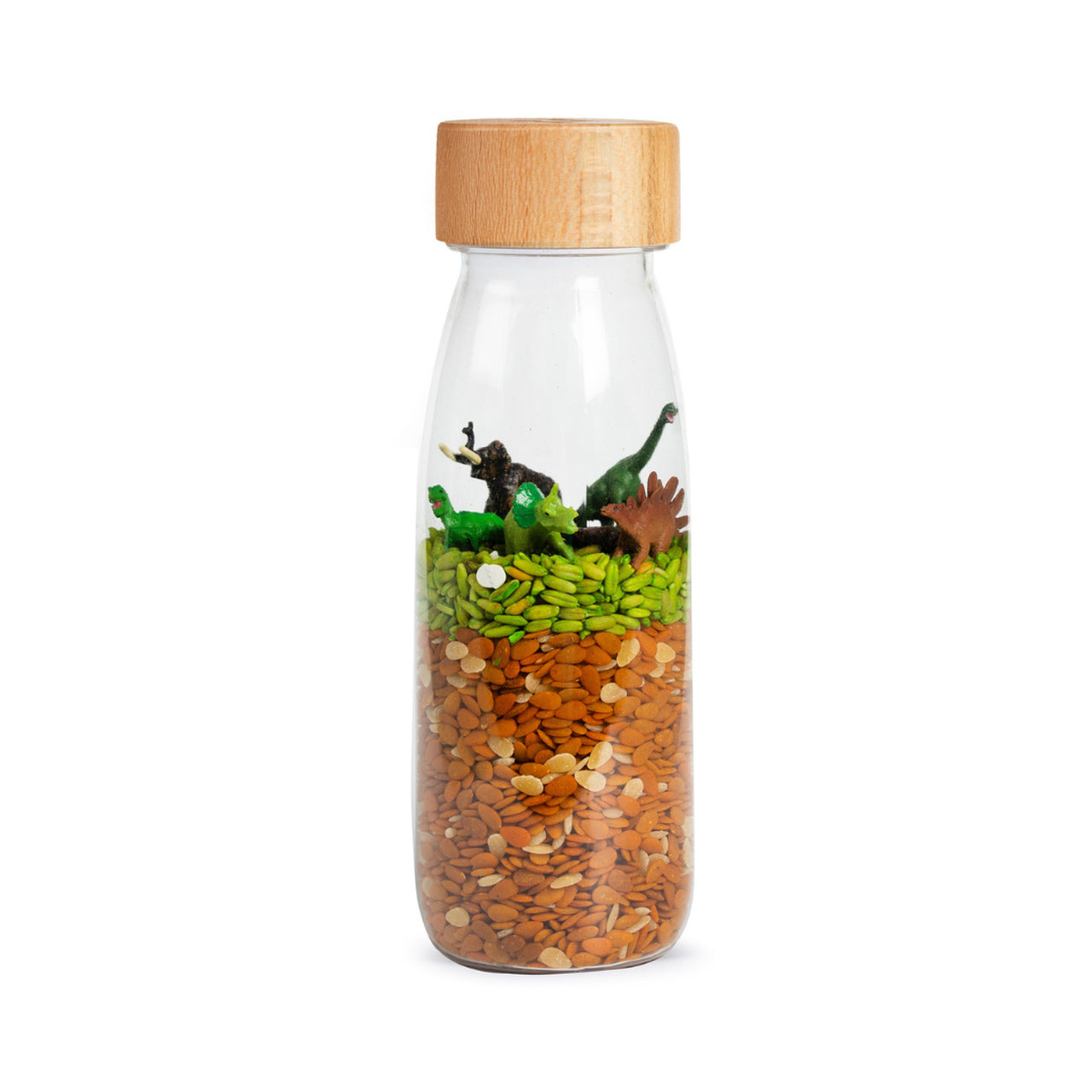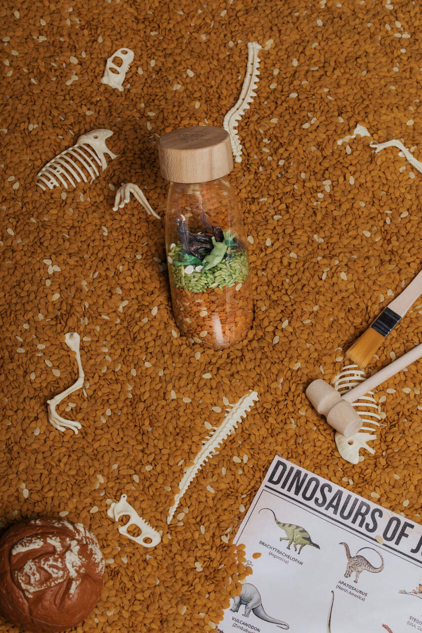 Mikrokosmos w każdej butelce. Bawią, uczą i stymulują wyobraźnię! Pozwól swojemu dziecku poruszać, potrząsać i manipulować butelką, aby odnaleźć ukryte kolory i figurki tematyczne zamknięte w butelce. Różnorodna zawartość butelek pozwala odkrywać nowe, ciekawe dźwięki charakterystyczne dla ukrytych w butelce elementów. Zabawa butelką od Petit Boum rozwija zmysły i wyobraźnię dziecka! Czy rozpoznasz butelki po ich dźwiękach? Czy znajdziesz w środku wszystkie dinozaury?