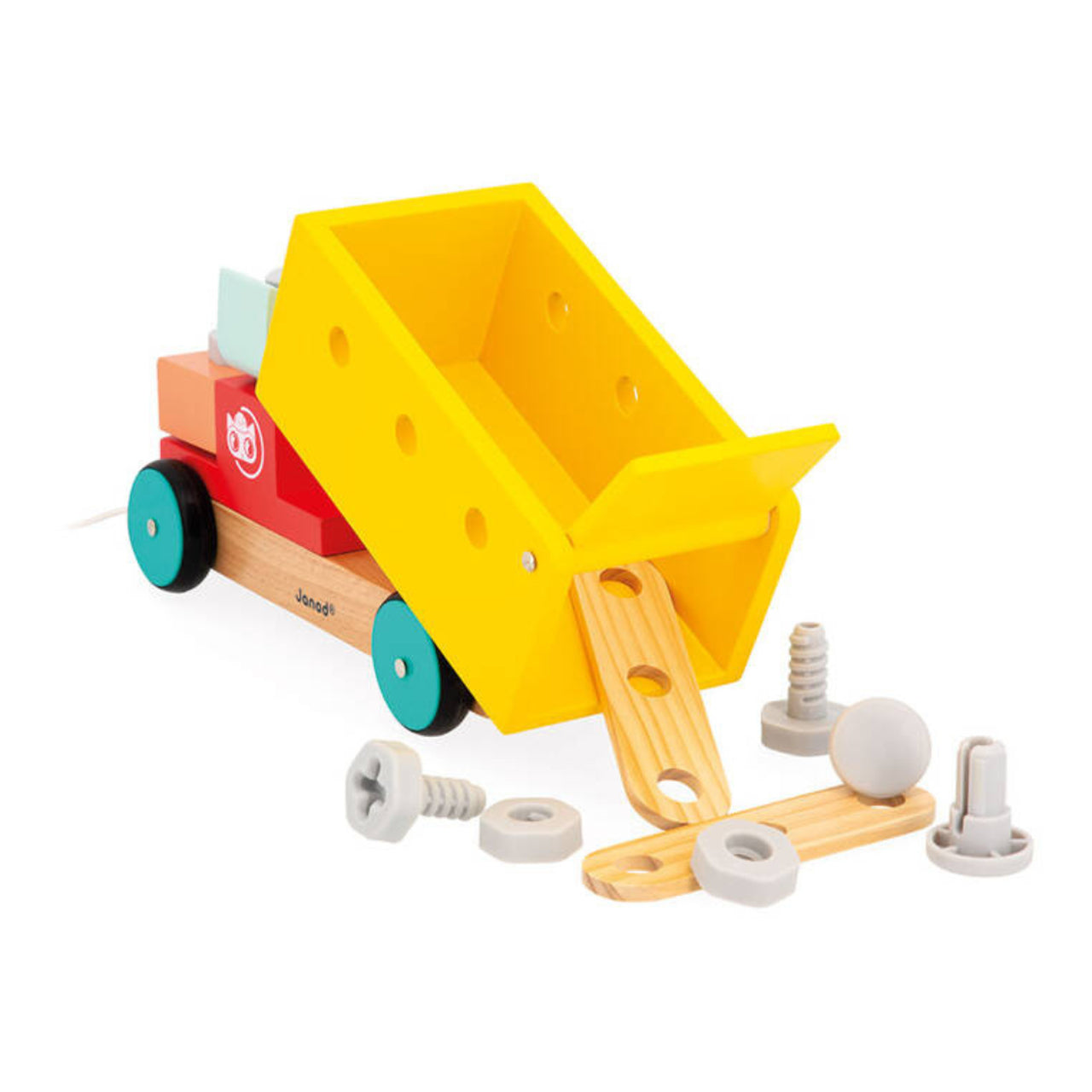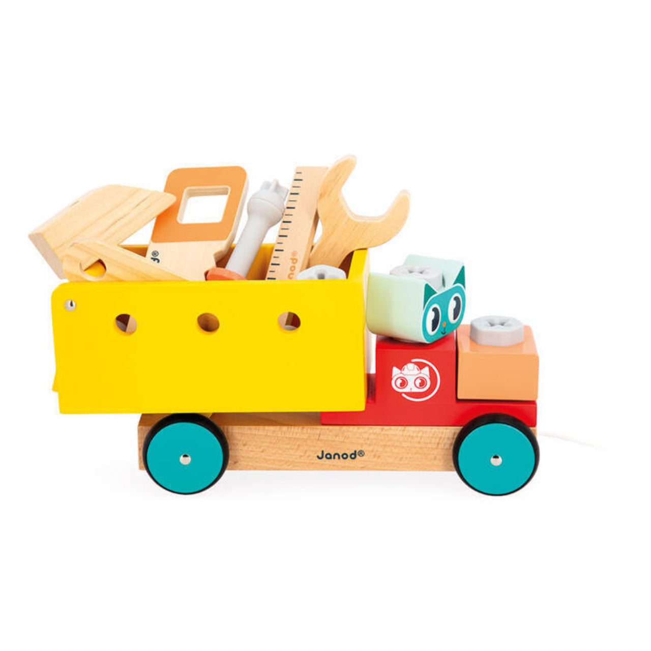 Drewniana ciężarówka do samodzielnego składania z narzędziami z serii Brico'Kids francuskiej marki JANOD to idealny prezent dla małego majsterkowicza. Zestaw składa się z 19 elementów – w tym części do zbudowania pojazdu – ciężarówki—wywrotki, śrubek, nakrętek, podkładek oraz śrubokręta, piły, młotka, linijki i klucza – narzędzi, niezbędnych przy stworzeniu konstrukcji. Jedną z części jest kierowca-kot.