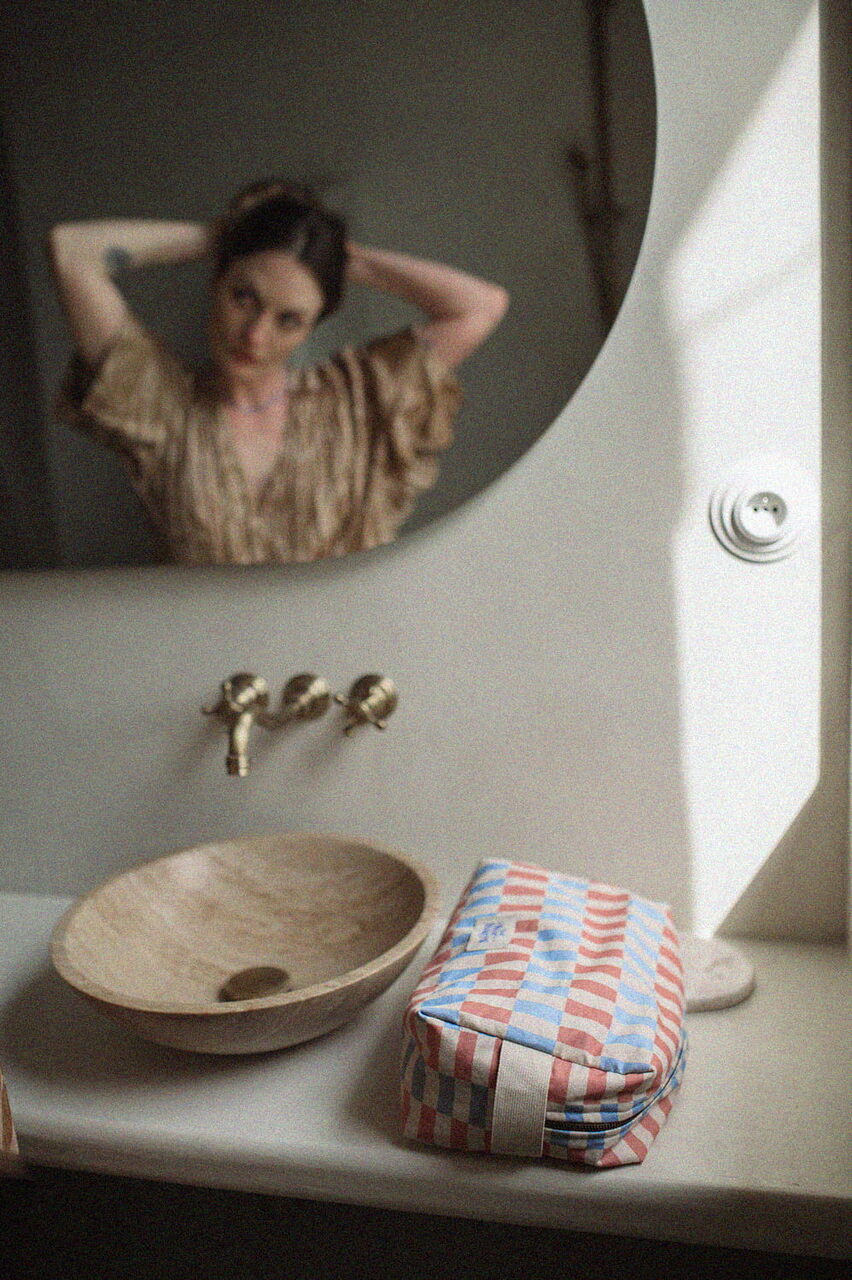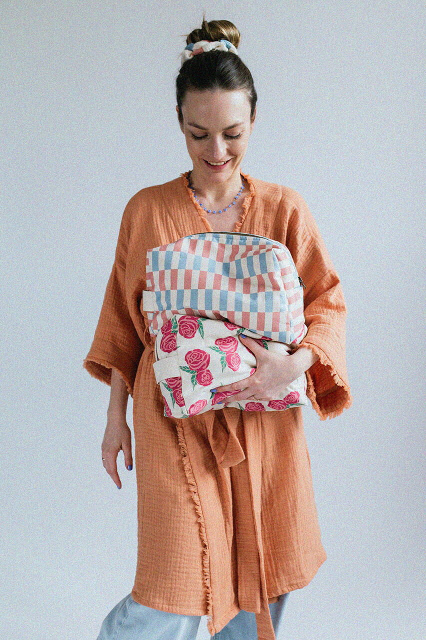 Duża, w 100% bawełniana kosmetyczka z mini kolekcji The Vintage is calling... . Podszewka w kontrastowym kolorze posiada właściwości wodoodporne. W środku umieściliśmy dwie kieszonki dla lepszej organizacji, a na zewnątrz wygodny, bawełniany uchwyt. Kosmetyczka jest miękka, przez co jest bardzo pojemna.