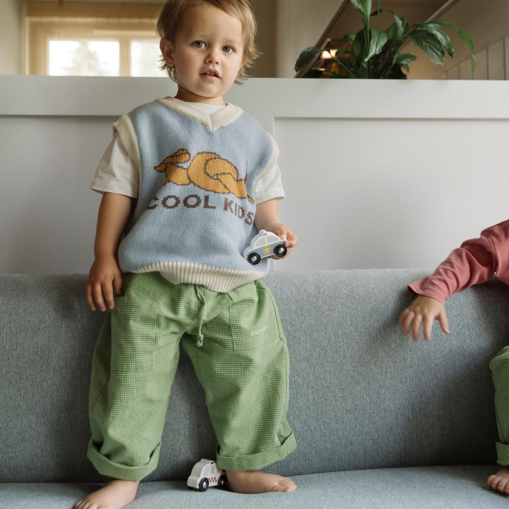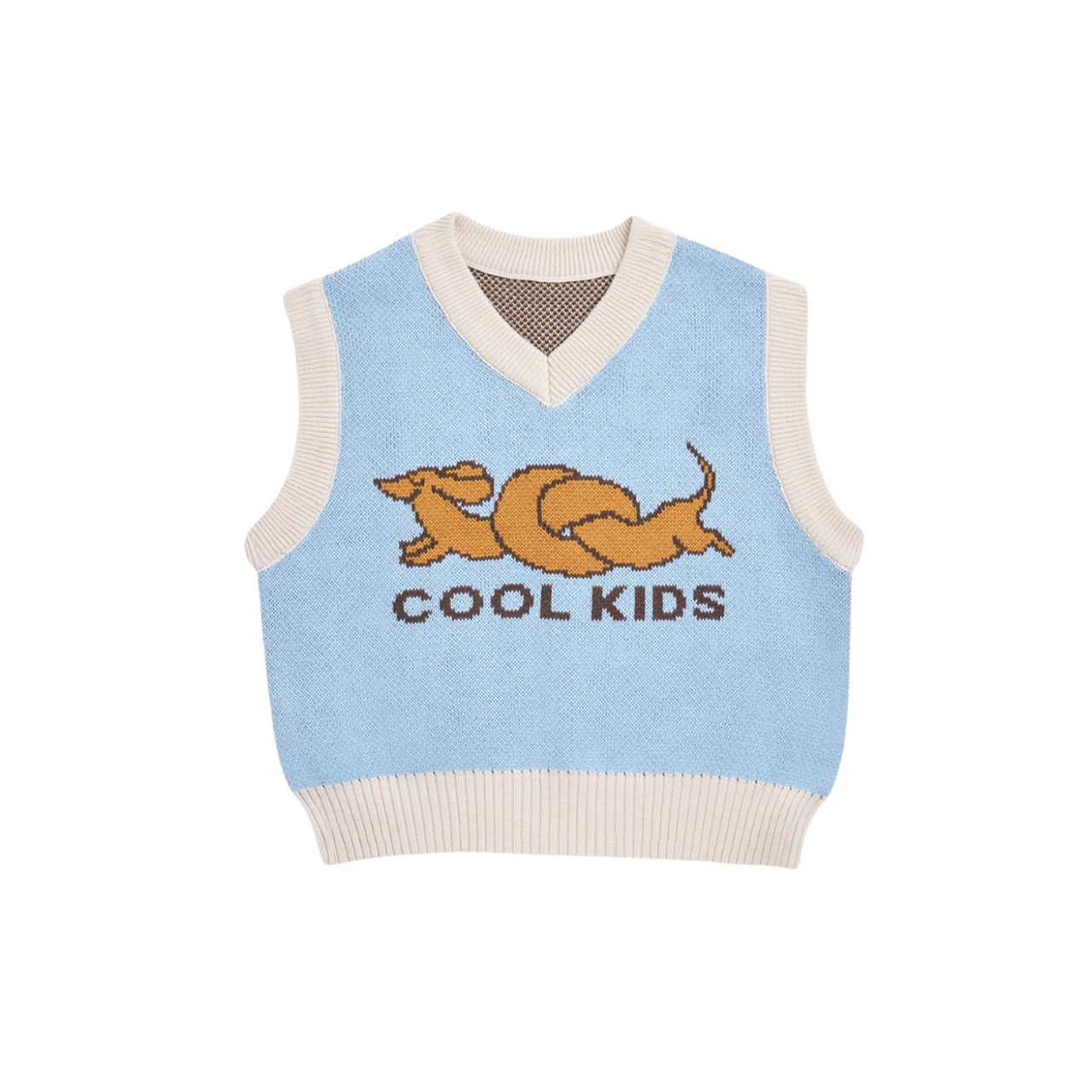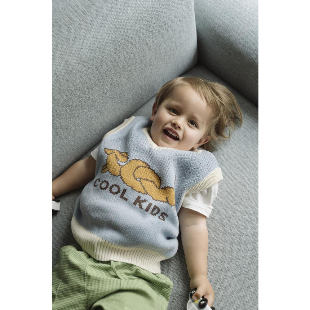 Dzianinowa kamizelka wykonana z wysokiej jakości bawełny organicznej, z naszym charakterystycznym motywem jamnika. Bardzo miękka w dotyku i nie drażniąca skóry — idealna dla wrażliwej skóry dzieci. Można ją nosić samodzielnie lub jako warstwę na T-shirt lub koszulkę z długim rękawem. Luźny krój zapewnia swobodę ruchów. Dostępna w zestawie z dzianinowymi spodniami, tworząc uroczą i wygodną stylizację.
