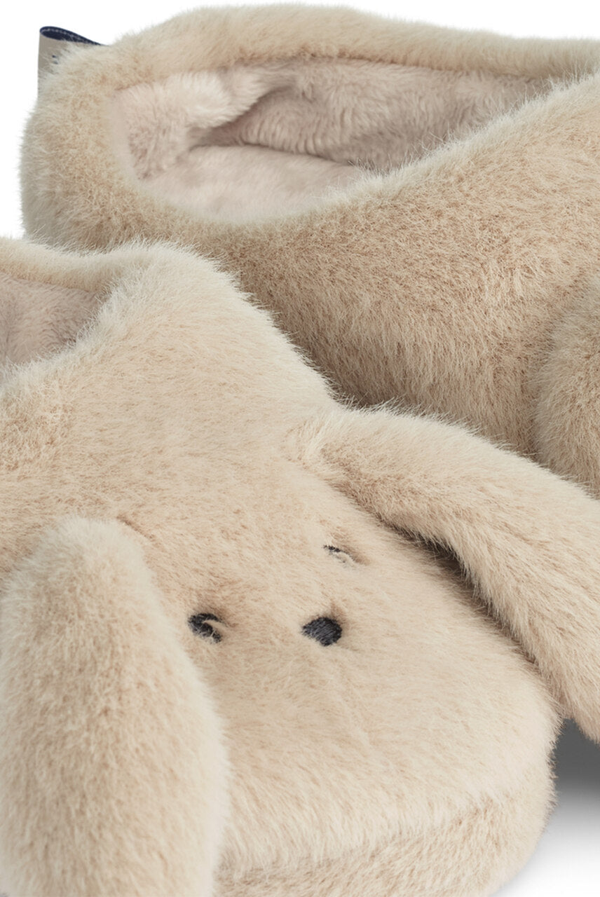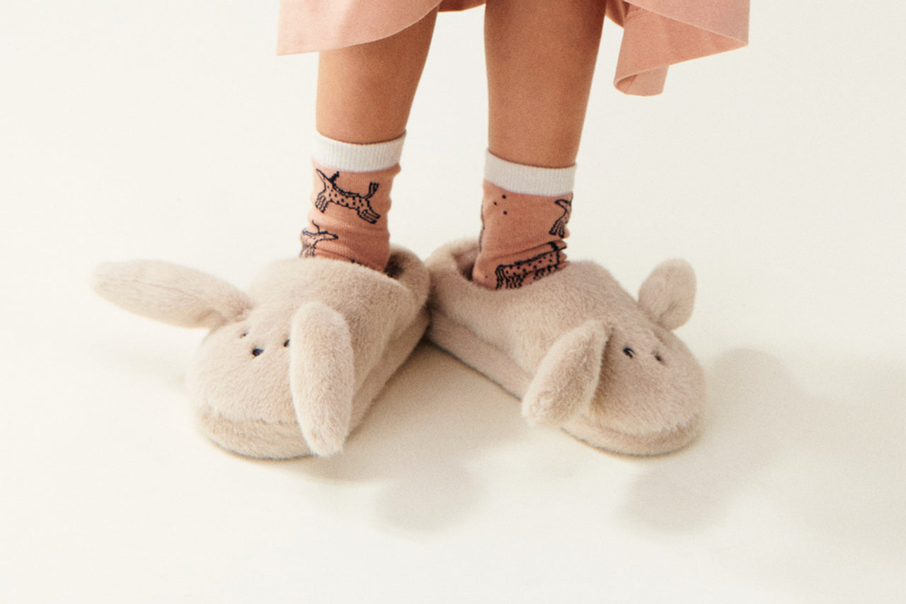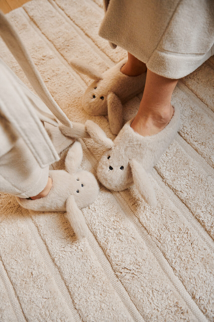 Słodkie i miękkie, pluszowe kapcie królika są wykonane z poliestru pochodzącego z recyklingu i zaprojektowane z myślą o chłodniejszych dniach.