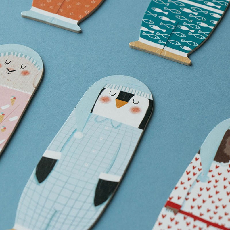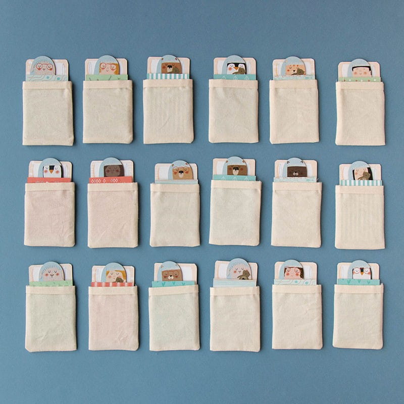 Gra zawiera: 18 kartonowych pościeli, 18 dwustronnych bawełnianych figurek: śpiących na plecach lub brzuchu, 2 karty potworów, 12 kart domów