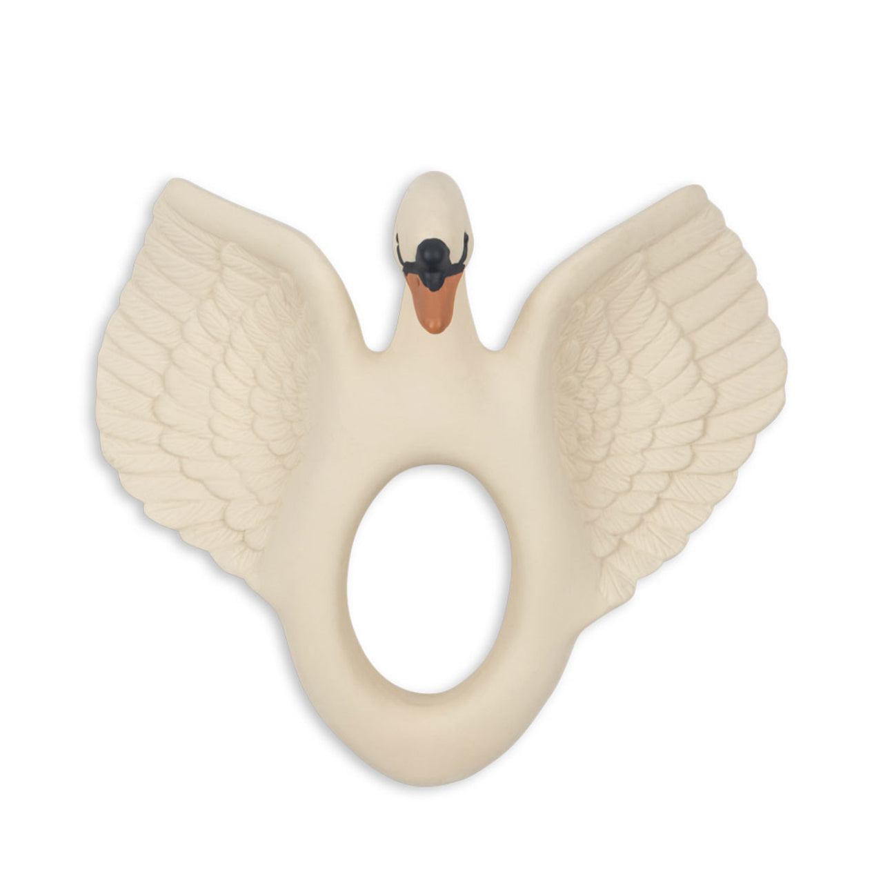 Gryzak w kształcie łabędzia, wykonany w 100% z naturalnego kauczuku dla ukojenia obolałych dziąseł dziecka. Gumowe zabawki pasują do malutkich rączek i pomagają dziecku zachować spokój i rozproszenie uwagi. A ich tekstura stymuluje zmysł wzroku, słuchu, węchu, dotyku i smaku. Posiada łatwy do uchwycenia pierścieniowy uchwyt z możliwością obracania.
