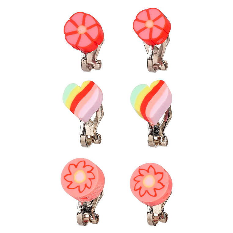 Zestaw klipsów Hera holenderskiej marki Souza! W jego skład wchodzą 3 pary srebrnych metalowych kolczyków mocowanych do ucha na metalowy klik (ich noszenie nie wymaga przekłuwania uszu!). Każdą z par zdobi inna aplikacja z tworzywa. W komplecie są klipsy z motywem: brzoskwiniowe kwiatki, tęczowe serduszka, brzoskwiniowe kółka.