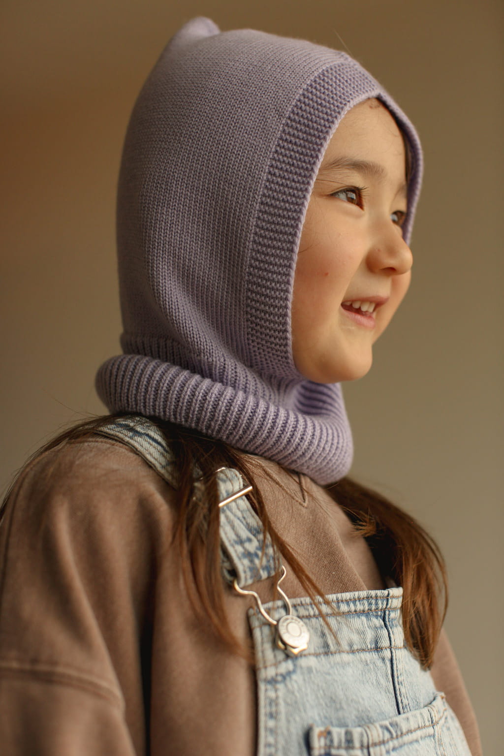 Czapka kominiarka (balaklawa) w lawendowym kolorze, wykonana z miękkiej wełny merino. Model unisex. Bezszwowa, utrzyma ciepło nawet w te najchłodniejsze dni. Ogrzeje nie tylko małą główkę, ale także szyje. Nie powoduje podrażnień, nie gryzie. Dostępna w dwóch rozmiarach: 1-3Y i 3-5Y. Wyprodukowana w Europie.