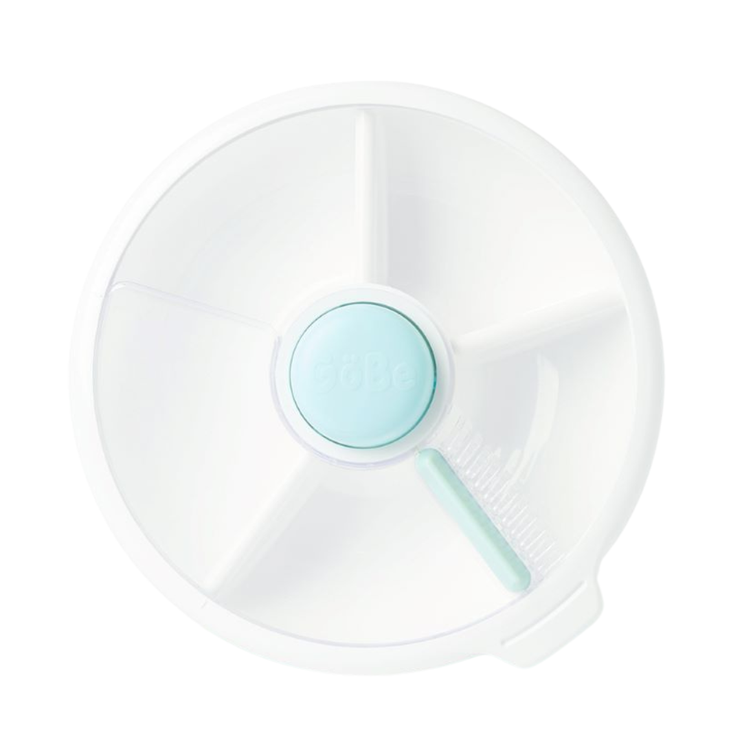 Duży, innowacyjny pojemnik na przekąski dla dzieci od GoBe Kids. Snack Spinner Slide umożliwia dziecku wybór spośród czterech różnych przekąsek, dzięki prostemu naciśnięciu przycisku. Dostęp do konkretnej przegródki uzyskujemy poprzez przesunięcie małej klapki. Dzięki Snack Spinner jedzenie warzyw, owoców czy słonych przekąsek stanie się dla dziecka przyjemnością i zabawą.