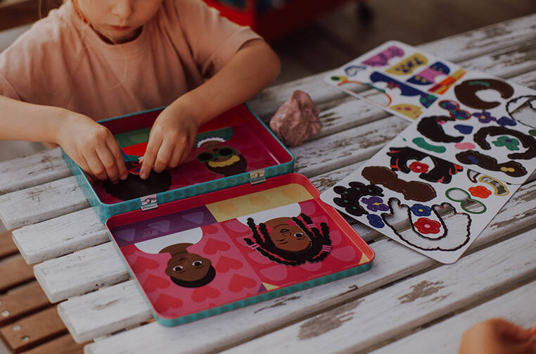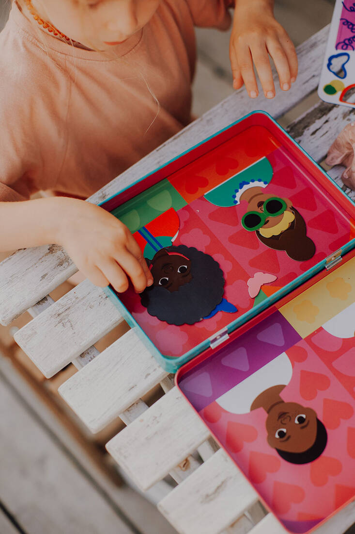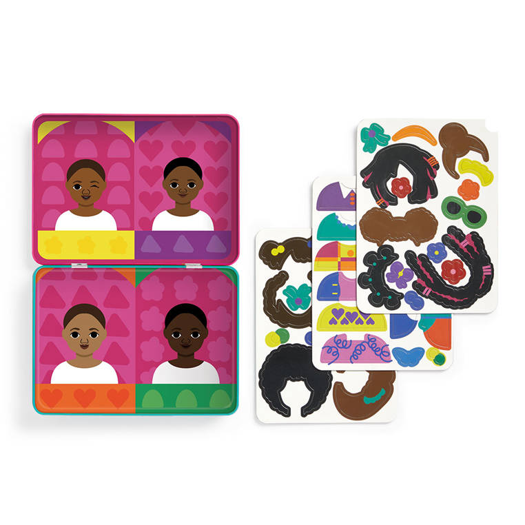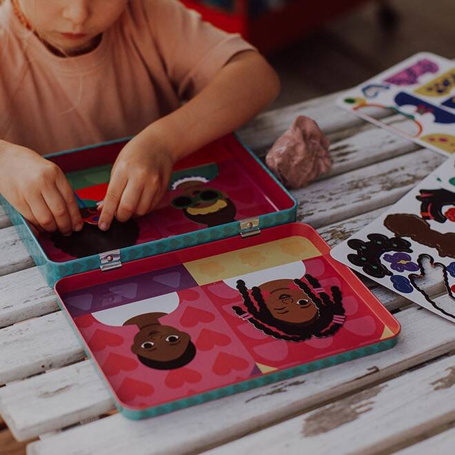 Zestaw magnesów do tworzenia postaci Moje włosy, moja korona amerykańskiej marki MUDPUPPY to wyjątkowo kreatywna zabawka dla dzieci od 4. roku życia. Na dwóch magnetycznych tłach, które są jednocześnie wewnętrzną stroną okładki, znajdują się cztery postacie-popiersia, którym można dobierać kolorowe stroje i niebanalne fryzury, np. afro, dredy czy warkoczyki. Można na nich umieszczać wybrane magnesy (ponad 40 elementów) – oprócz wspomnianych są to także ozdoby do włosów czy okulary przeciwsłoneczne – tworząc wiele różnych stylizacji. Autorką ilustracji jest amerykańska artystka Tabitha Brown, fascynatka kolorów i ludzi. Zabawka ma poręczny format, sprawdza się w domu i w podróży. Zapakowana jest w estetyczne, metalowe pudełko. Doskonale nadaje się na prezent.