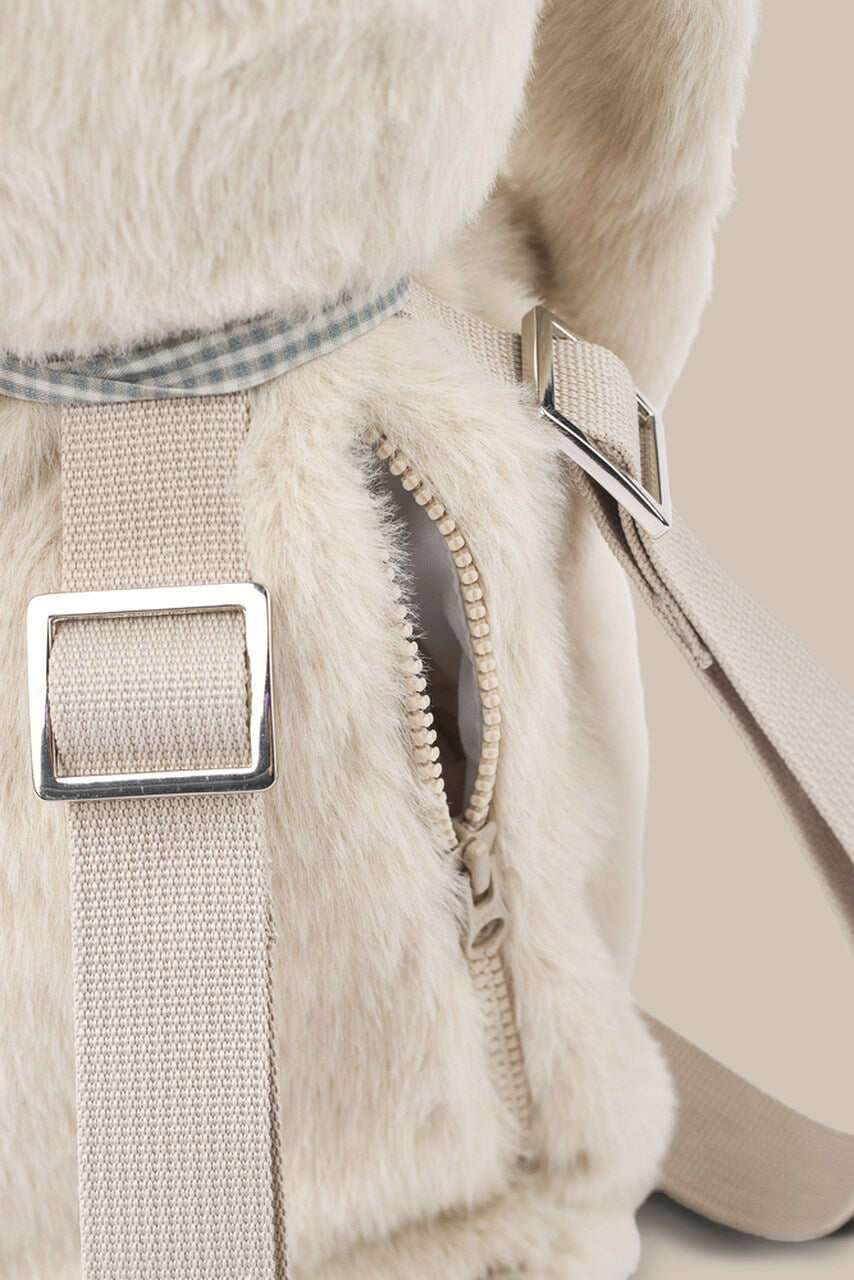 Pluszowy plecak w kształcie królika z regulowanymi paskami na ramiona. Plecak posiada komorę zapinaną na zamek błyskawiczny.