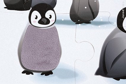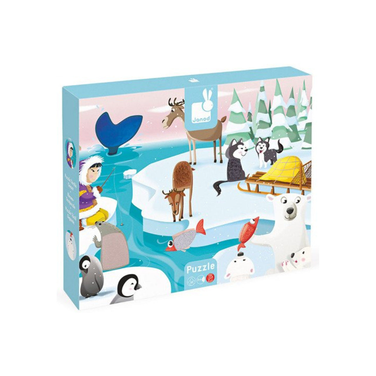 Duży zestaw puzzli sensorycznych francuskiej marki JANOD. Składa się z 20 elementów. Ułożony z nich obrazek przedstawia życie w lodowej krainie. Jej mieszkańców dziecko może poznać także sensorycznie – sierść czy skóra siedmiu zwierząt wykonane zostały z teksturowanych materiałów. Dotykanie różnorodnych tekstur imituje prawdziwe wrażenia empiryczne i rozwija dziecięcy zmysł dotyku. Wzbudza też dodatkowe zainteresowanie układanką.