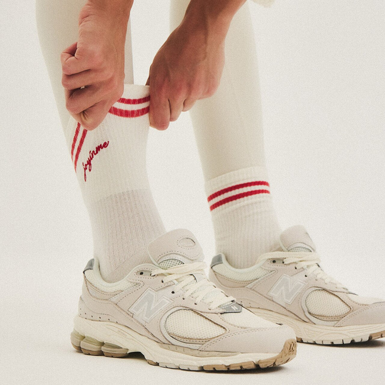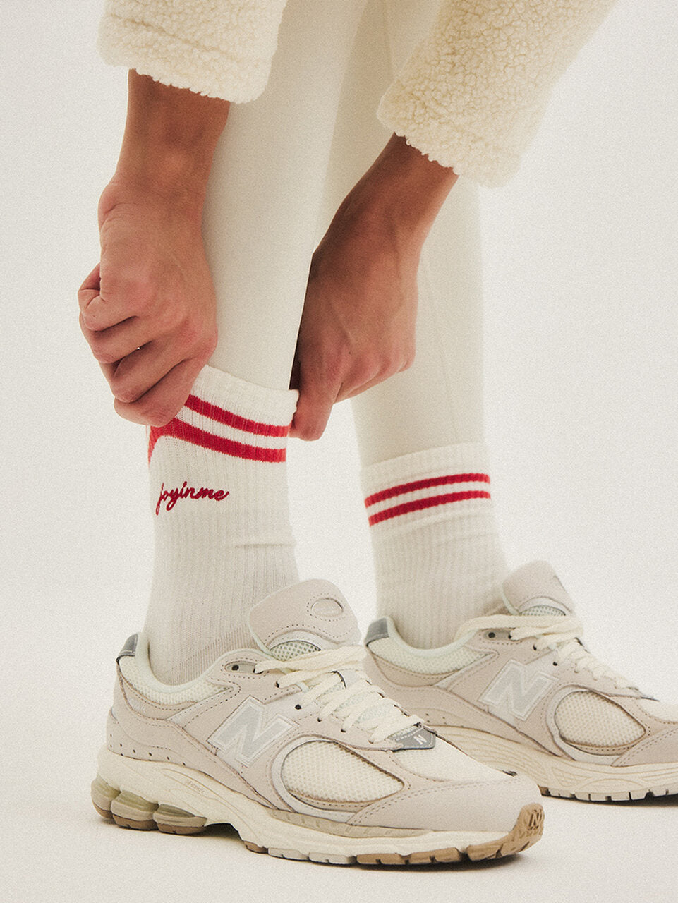 Kwintesencja sportowego stylu, czyli jasne, prążkowane skarpetki z paskami i logo JOYINME. Dla tych, które inspirują się modą streetwearową, lub po prostu żyją aktywnie. Świetny sposób, by dodać sportowego charakteru i koloru każdej stylizacji. My lubimy je zarówno w zestawieniu z delikatnym beżem, jak i wyrazistą malinową czerwienią.