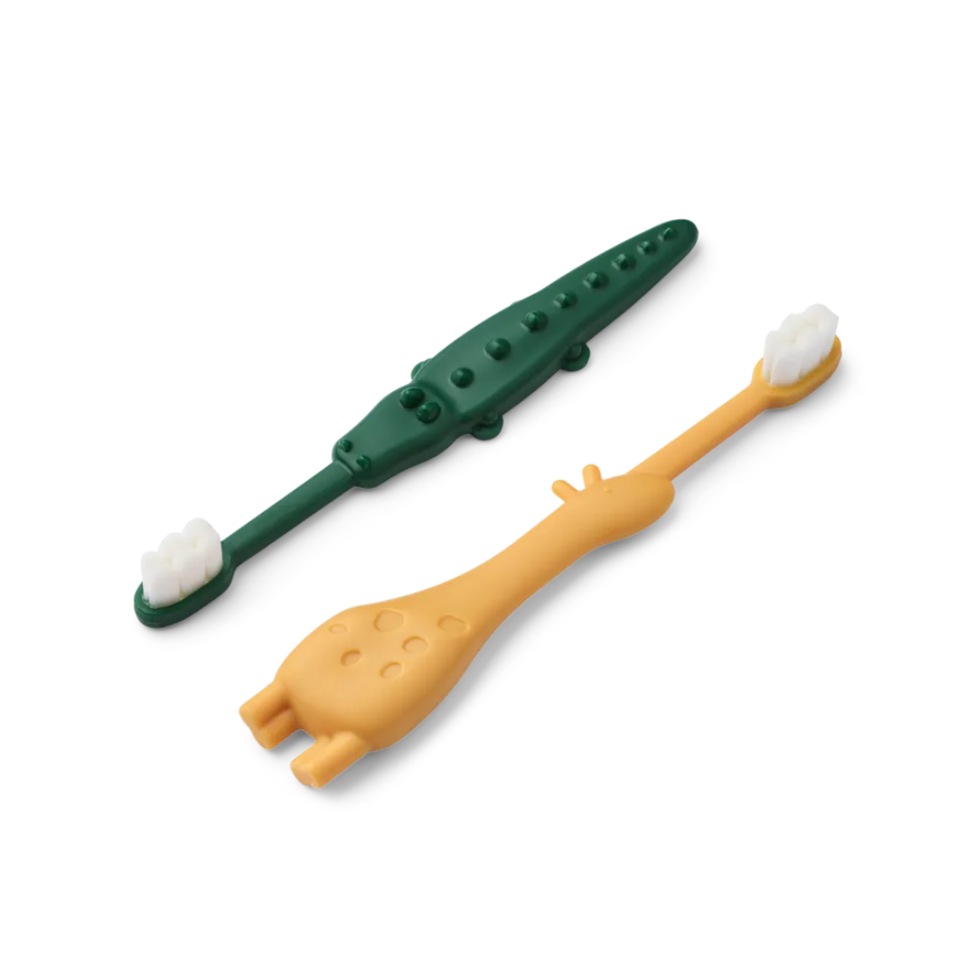 Zabawna szczoteczka do zębów dla maluchów z delikatnym włosiem. Każde włosie z nanowłókien zapewnia usuwanie resztek jedzenia, płytki bakteryjnej i przebarwień między zębami i dziąsłami. Tył szczoteczki ma kropkowaną strukturę zaprojektowaną, aby pomóc w czyszczeniu języka. Uchwyt w kształcie krokodyla i żyrafy.