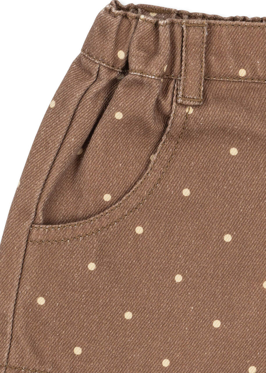 Wzór Ermine Dot dodaje całości subtelnego uroku i wyróżnia model na tle klasycznych jeansowych spodenek. To delikatny, charakterystyczny detal, który wpisuje się w estetykę skandynawskiej marki Konges Sløjd – minimalistycznej, ale pełnej dziecięcej lekkości.