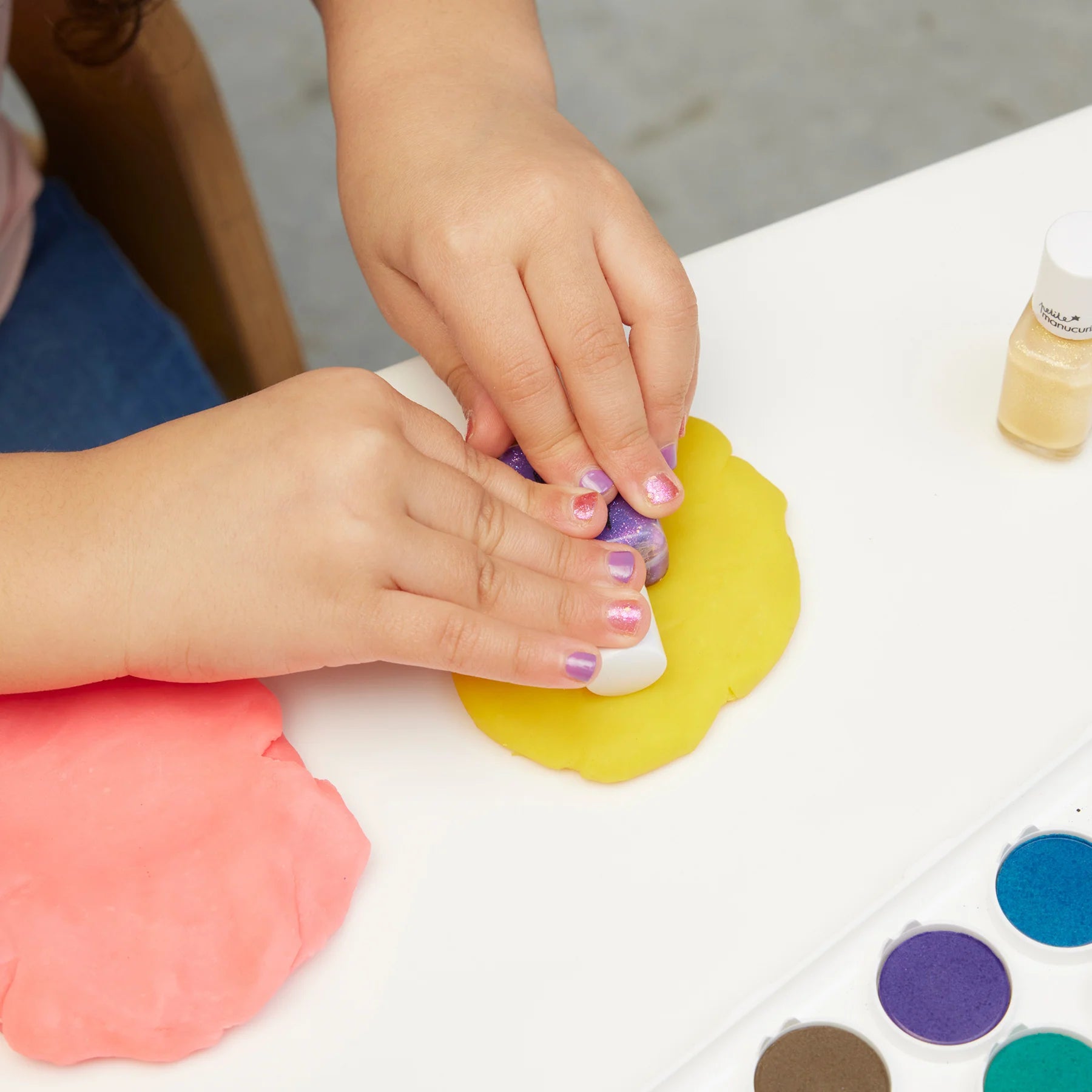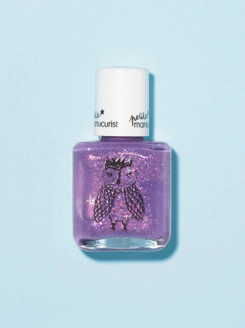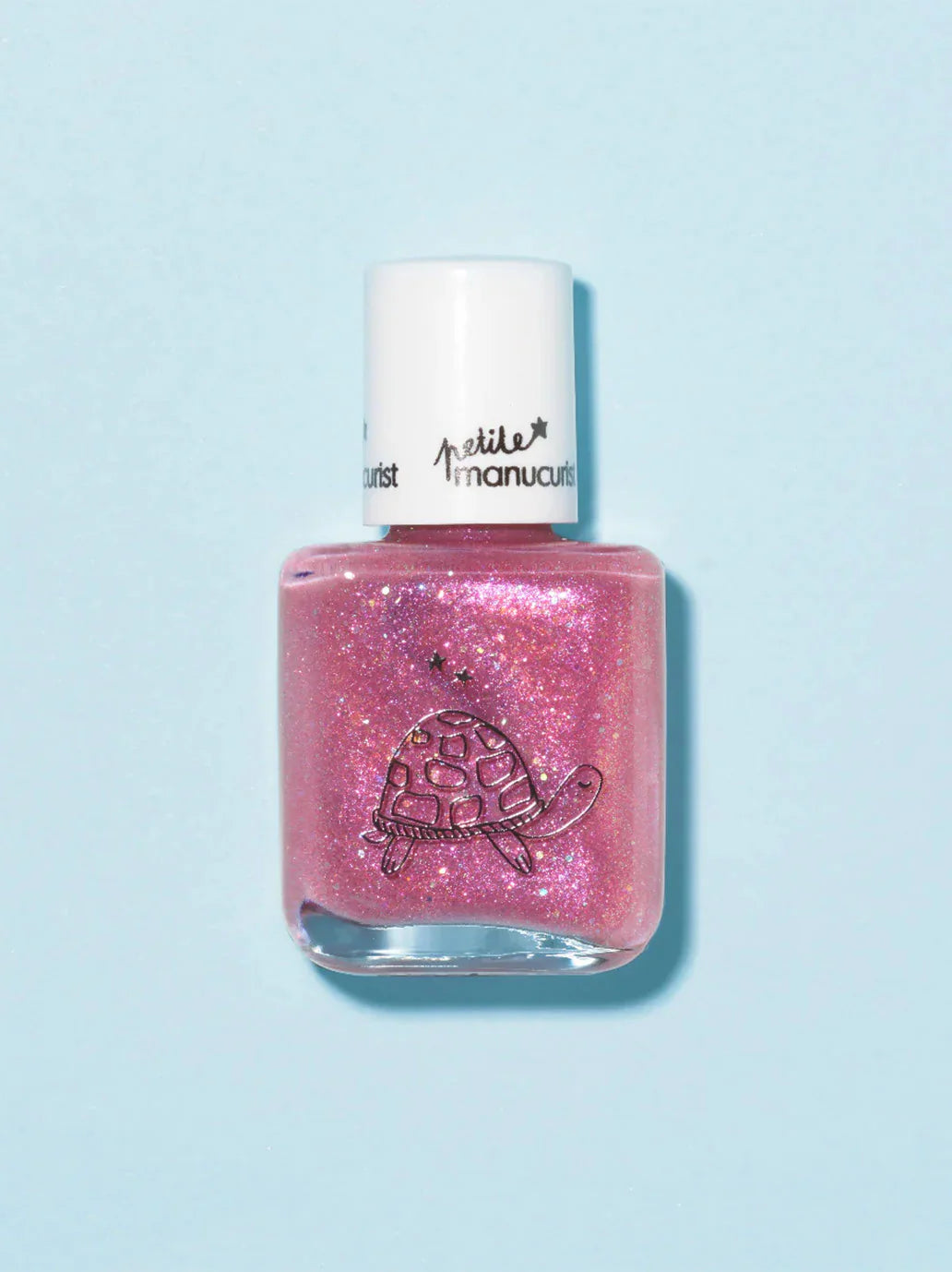 Zestaw lakierów do paznokci dla dzieci składający się z brokatowego malinowego różu, brokatowego bladego różu i brokatowego fioletu. Lakiery Petite Manucurist mają tak czystą formułę, że dzieci mogą ich bezpiecznie używać i usuwać wodą z mydłem.