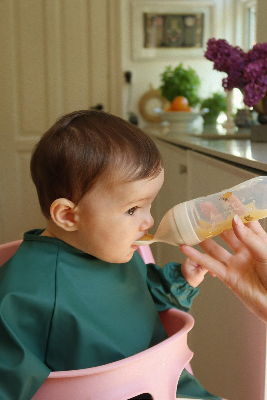Prosty i praktyczny zestaw do karmienia niemowląt, wykonany z materiałów bezpiecznych dla żywności, bez BPA. Wystarczy napełnić silikonową butelkę puree i delikatnie nacisnąć, aż na łyżeczce znajdzie się odpowiednia ilość pokarmu. Łyżeczka ma ergonomiczną konstrukcję i jest łatwa w użyciu. Zestaw do karmienia jest wyposażony w praktyczną pokrywkę, która zapobiega wyciekaniu pokarmu. Do zestawu dołączona jest silikonowa łyżeczka.