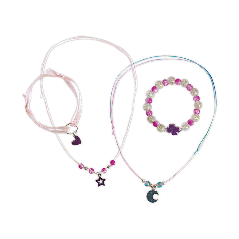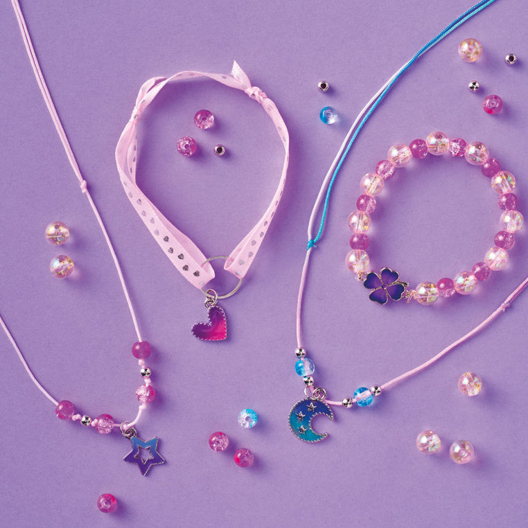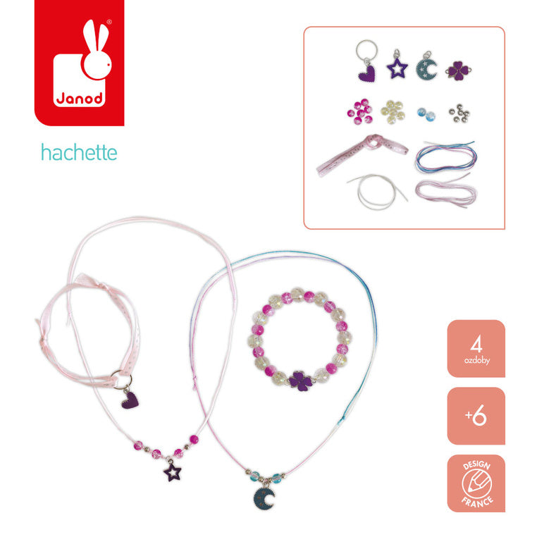 Zestaw kreatywny do tworzenia biżuterii z zawieszkami zmieniającymi kolor francuskiej marki JANOD. Pozwoli stworzyć w sumie aż 4 sztuki ozdób: 2 naszyjniki i 2 bransoletki. W jego skład wchodzą: koraliki w różnych kolorach (różowe, srebrne, niebieskie, brokatowe), 2 nitki (różowa i tęczowa), wstążka w serduszka oraz 4 wyjątkowe zawieszki – serce, gwiazda, księżyc i koniczyna – "magicznie" zmieniające kolor w kontakcie ze skórą (pod wpływem ciepła).